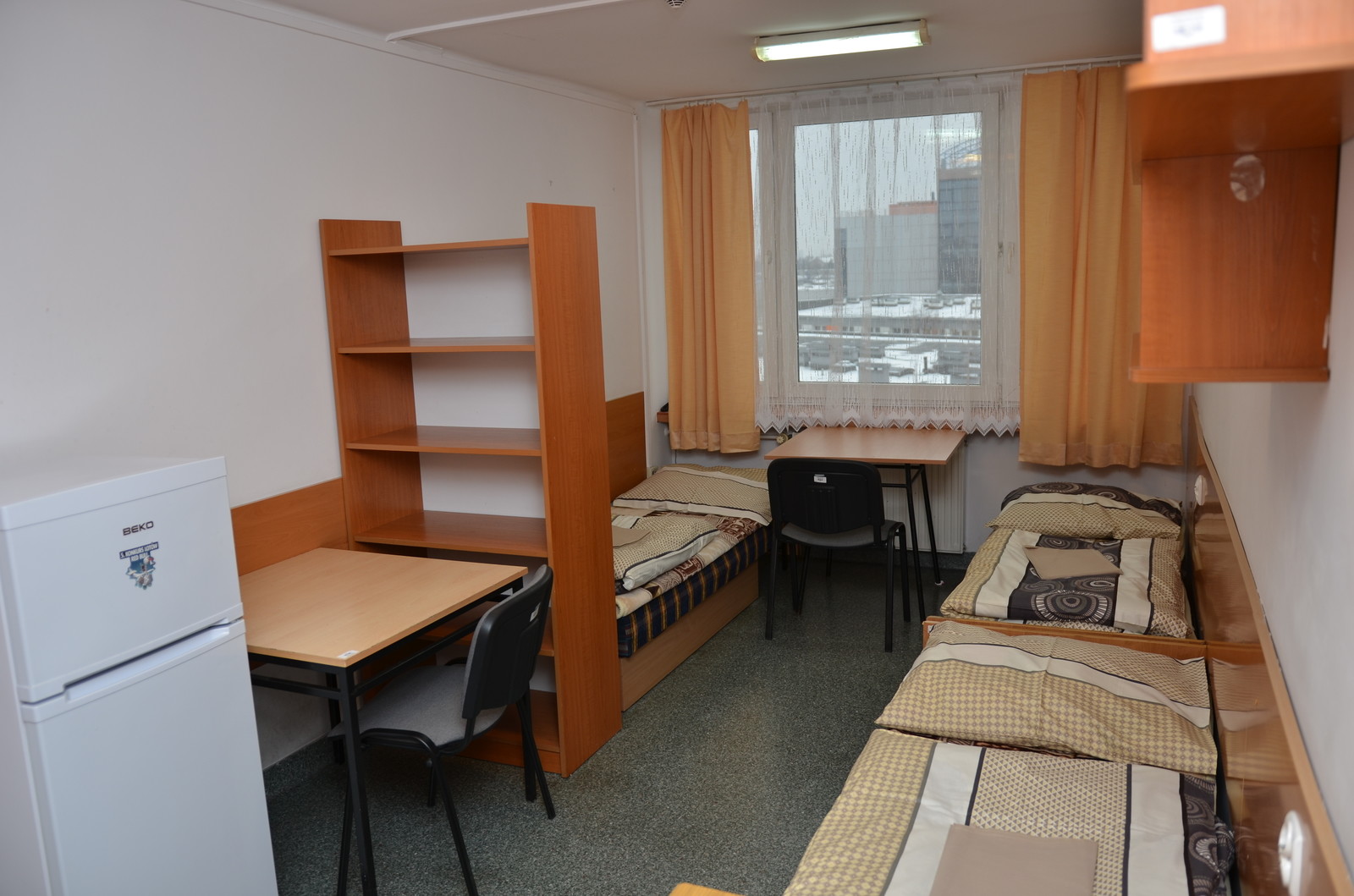 Pokoje 2 i 3 osobowe (o standardowym wyposażeniu: lodówka, tapczan, łóżko, stolik, biurko, krzesło, szafa ubraniowa) w połączeniu z łazienkami tworzą segmenty. Kuchnie dostępne są na każdym piętrze.